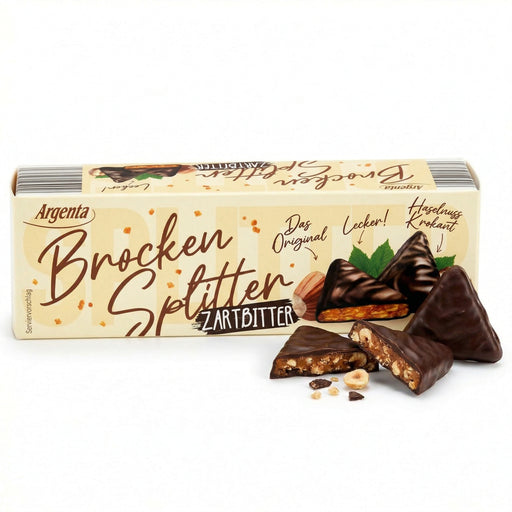 Genuss in jeder Ecke! Die Brockensplitter – Das Original vereinen knackigen Haselnusskrokant mit zartschmelzender Zartbitterschokolade. Ein unwider...