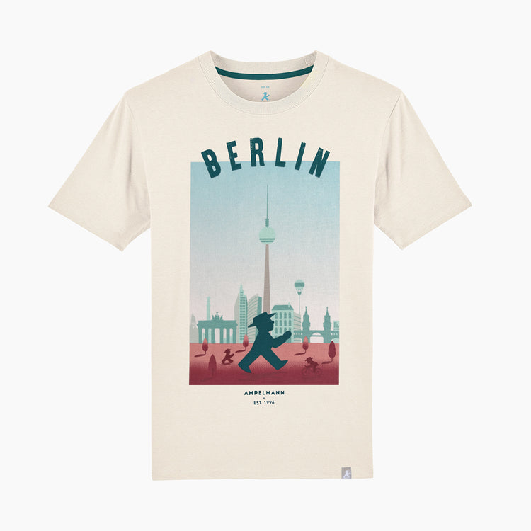 AMPELMANN als Stadtführer im Einsatz! Dieses stylische, hellbeige T-Shirt aus 100% BIO-Baumwolle zeigt liebevoll illustrierte Berlin-Motive und ist ein echtes Must-have für kleine Hauptstadtfans. Ob Fernsehturm, Brandenburger Tor oder Gedächtniskirche – mit diesem Shirt wird Berlin ganz groß!