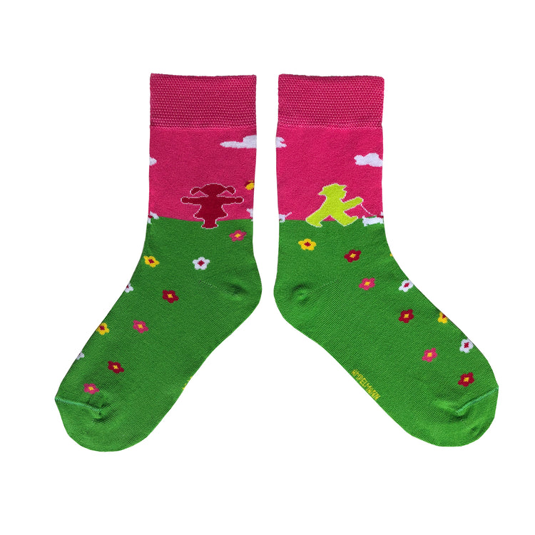 Pink-grüne Kinder-Socken mit Ampelmann & Ampelfrau auf der Blümchenwiese - guter Tragekomfort