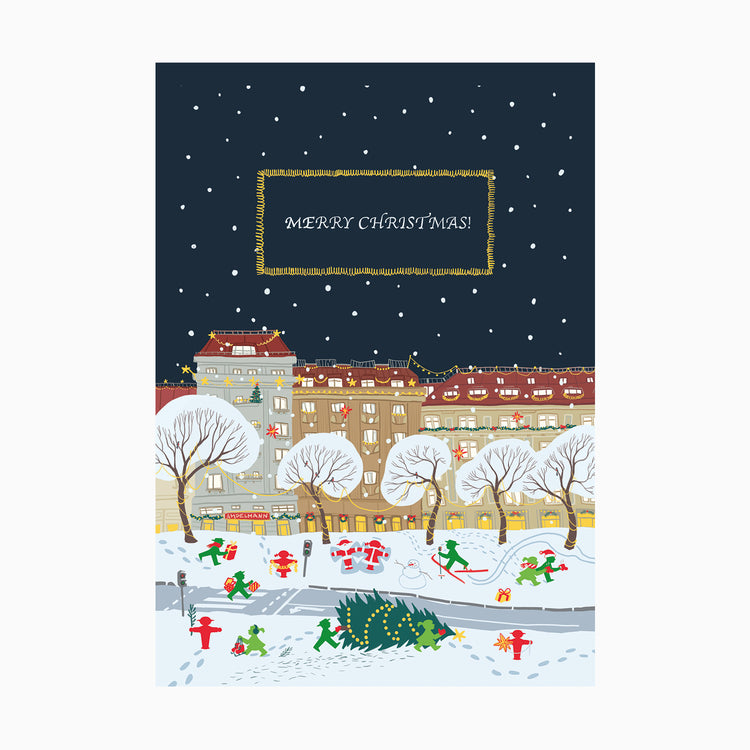 Weihnachtswünsche-Postkarte MERRY CHRISTMAS! mit Ampelfiguren im Winter in der Stadt