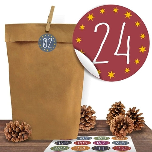 Adventskalender Bastelset – 25 Kraftpapiertüten mit 24 bunten Adventsaufklebern zum Befüllen