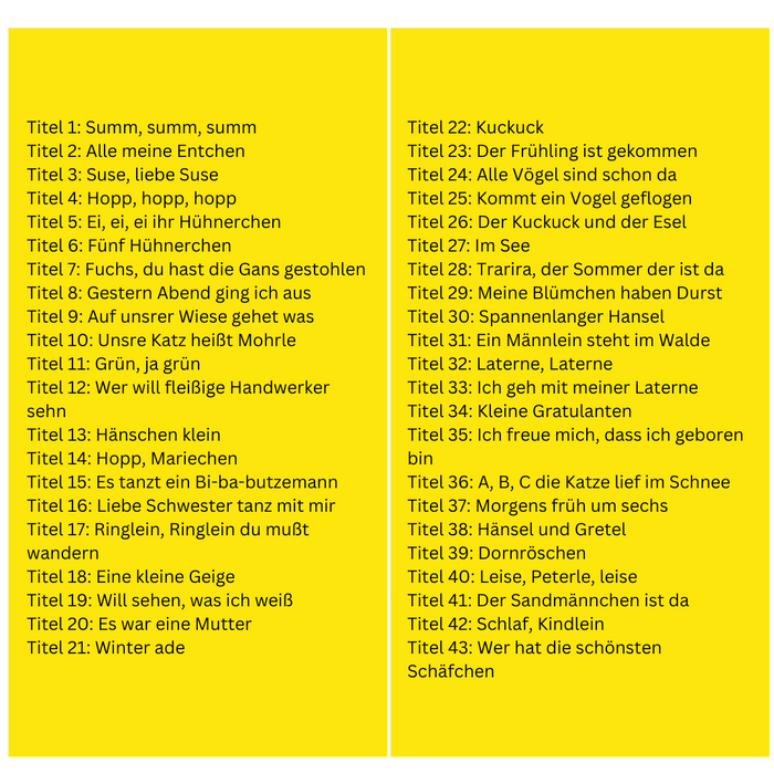 Titel 1: Summ, summ, summ I Titel 2: Alle meine Entchen I Titel 3: Suse, liebe Suse I Titel 4: Hopp, hopp, hopp I Titel 5: Ei, ei, ei ihr Hühnerchen I Titel 6: Fünf Hühnerchen I Titel 7: Fuchs, du hast die Gans gestohlen I Titel 8: Gestern Abend ging ich aus I Titel 9: Auf unsrer Wiese gehet was I Titel 10: Unsre Katz heißt Mohrle I Titel 11: Grün, ja grün I Titel 12: Wer will fleißige Handwerker sehn I Titel 13: Hänschen klein I Titel 14: Hopp, Mariechen I Titel 15: Es tanzt ein Bi-ba-butzemann I Titel 16: Liebe Schwester tanz mit mir I Titel 17: Ringlein, Ringlein du mußt wandern I Titel 18: Eine kleine Geige I Titel 19: Will sehen, was ich weiß I Titel 20: Es war eine Mutter I Titel 21: Winter ade I Titel 22: Kuckuck I Titel 23: Der Frühling ist gekommen I Titel 24: Alle Vögel sind schon da I Titel 25: Kommt ein Vogel geflogen I Titel 26: Der Kuckuck und der Esel I Titel 27: Im See I Titel 28: Trarira, der Sommer der ist da I Titel 29: Meine Blümchen haben Durst I Titel 30: Spannenlanger Hansel I Titel 31: Ein Männlein steht im Walde I Titel 32: Laterne, Laterne ITitel 33: Ich geh mit meiner Laterne I Titel 34: Kleine Gratulanten I Titel 35: Ich freue mich, dass ich geboren bin I Titel 36: A, B, C die Katze lief im Schnee I Titel 37: Morgens früh um sechs I Titel 38: Hänsel und Gretel I Titel 39: Dornröschen I Titel 40: Leise, Peterle, leise I Titel 41: Der Sandmännchen ist da I Titel 42: Schlaf, Kindlein I Titel 43: Wer hat die schönsten Schäfchen