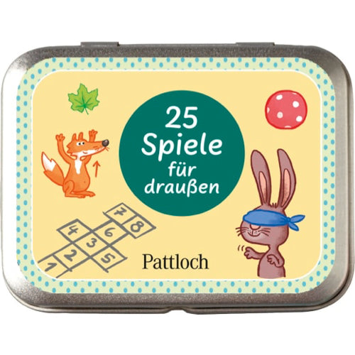 Auf 25 stabilen Karten finden sich einfach erklärte Spiel-Ideen für Kinder ab 5 Jahre, die garantiert für Spiel und Spaß an der frischen Luft sorgen. Die Kinder können sofort mit dem Spielen loslegen, da für die Spiele außer einem Ball nur Materialien aus der Natur benötigt werden. Die kleine Kartenbox aus Metall passt in jede Tasche und ist ein tolles Geschenk zu Ostern, für die Schultüte oder den Adventskalender.