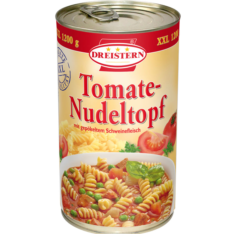 Genießen Sie den köstlichen Tomate Nudeltopf (Dreistern) mit hausgemachten Tomatensauce und zarten Nudeln. Praktisch verpackt in einer 1200g Packung, ist dieses Gericht perfekt für eine schnelle und sättigende Mahlzeit. Einfach in der Zubereitung und voller Geschmack - für alle, die gut und lecker essen möchten.
