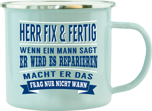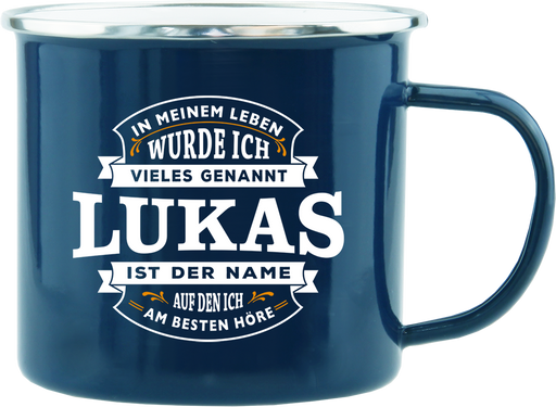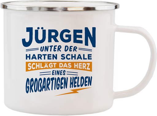 Emaille Becher / Tasse Jörg Allwissender, helle Leuchte