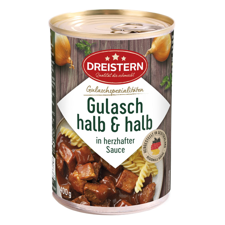 Appetit auf etwas Deftiges, aber wenig Zeit zum Kochen? Mit dem DREISTERN Gulasch halb & halb bringst du in wenigen Minuten einen klassischen Genuss auf den Tisch. Zartes Rind- und Schweinefleisch in einer fein abgeschmeckten, herzhaften Sauce sorgt für einen natürlichen, intensiven Geschmack – perfekt für Genießer.