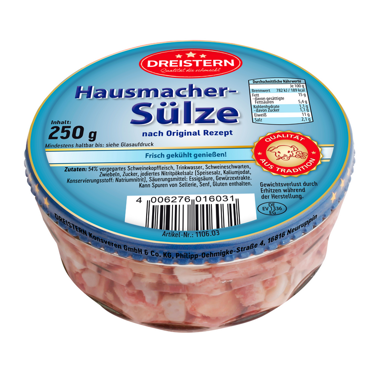 Der Klassiker für Liebhaber traditioneller Hausmannskost! Die Hausmacher Sülze von Dreistern überzeugt mit ihrem herzhaften Geschmack und einer Rezeptur wie selbst gemacht. Einfach frisch gekühlt genießen und echte Qualität aus Tradition erleben.