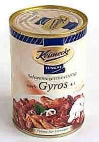 Zutaten: Trinkwasser, Gyrosfleisch (35%)(Schweinefleisch, vorgegart), Zwiebeln (12,5%), Pflanzenöl, modifizierte Stärke, Gewürze, Tomatenmark, Jodsalz, Zucker, Weizenmehl, gekörnte Brühe, Geschmacksverstärker:Mononatriumglutamat, Hefeextrakt, Verdickungsmittel: Guarkernmehl und Xanthan, Aroma.