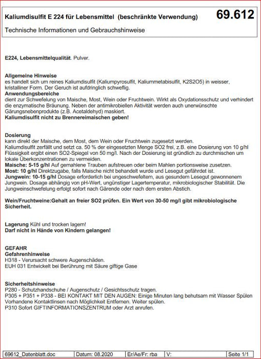 Zutaten: Konservierungsstoff E224 ( Kaliumdisulfit )