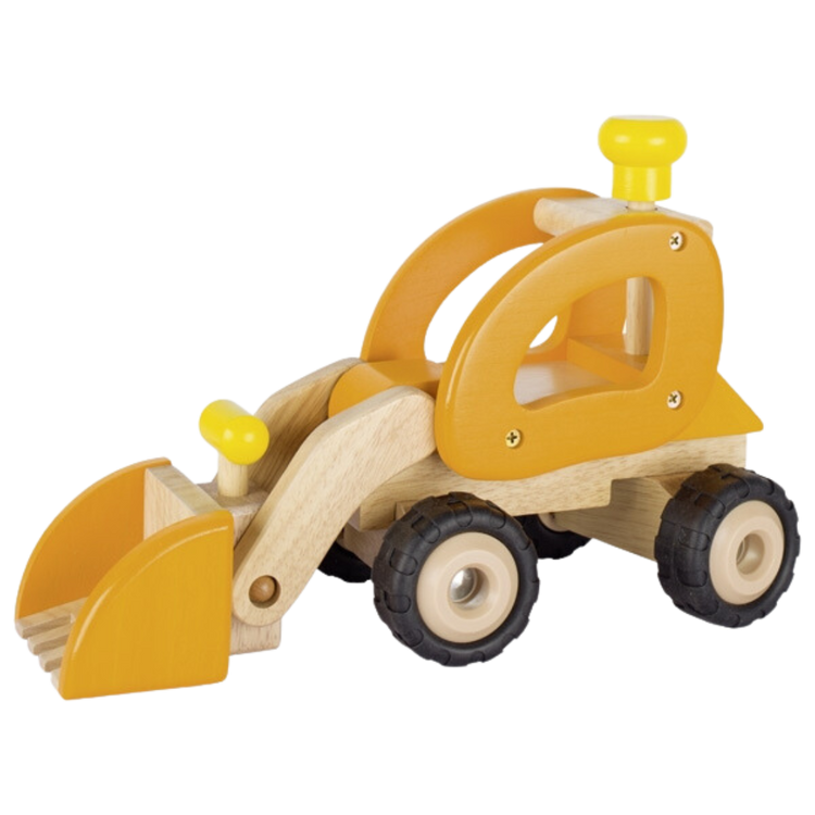 Dieser robuste Holz-Bagger/Radlader ist das perfekte Spielzeug für baubegeisterte Kinder und jung Gebliebene! Mit seiner beweglichen Schaufel und leisen Gummireifen kurvt er spielerisch durchs Kinderzimmer und ist bereit, alles aufzugabeln, was ihm vor die Schaufel kommt. Ideal für kleine Hände, lässt sich die Schaufel mühelos nach oben und unten bewegen – ein echtes Vergnügen auch für die Jüngsten.