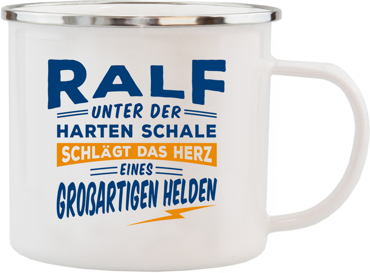 Emaille Becher / Tasse Ralf das Herz eines großartigen Helden