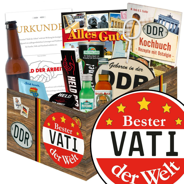 Vati ist der Beste! Also hat er auch ein originelles Geschenk verdient. Allerdings sind Geschenke für Papas nicht immer ganz einfach, denn eigentlich haben die Vatis ja schon alles und wünschen sich in der Regel auch nie etwas. Das Ossi-Paket „Bester Vati/Papa“ ist mit den beliebtesten Kultartikeln und Schlemmereien aus der damaligen DDR gefüllt und in einer kultigen Nostalgiebox verpackt. „Vati“ passt nicht so recht zu Ihrem Vater? Er ist und wird einfach immer Ihr „Papa“ bleiben? Kein Problem den entsprechenden Aufkleber „Bester Papa“ liefern wir gleich mit- einfach über den Vati-Aufkleber kleben. Diese Geschenkbox sorgt garantiert bei jeder Sorte Papa für Freudestrahlen- ganz egal, ob es sich bei Ihrem Vati um einen wahren DDR-Zeitzeugen handelt oder nicht. Überraschen Sie Ihren Papa zum Vatertag oder an jedem anderen Tag im Jahr und entführen Sie ihn auf eine nostalgische Zeitreise.