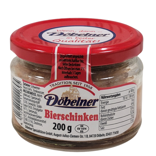 Vollständige Details anzeigenDöbelner Spezialität Bierschinken, 200 g – schnittfeste Wurstspezialität mit 84 % Schweinefleisch