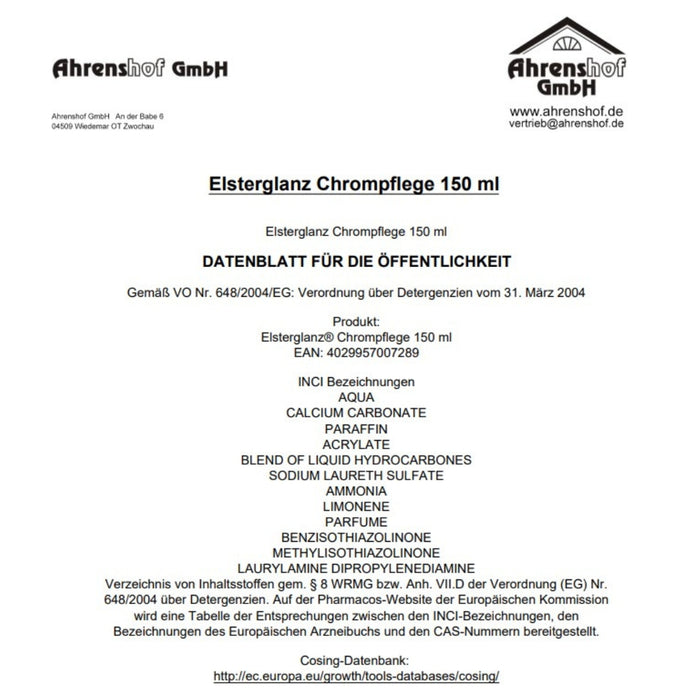 Elsterglanz Chrompflege ist eine zuverlässige Lösung zum Reinigen, Polieren und Konservieren von Chromflächen. Die säurefreie Formel ätzt nicht und ist dank natürlicher Rohstoffe absolut schonend für das Material. Spezielle Inhaltsstoffe wirken reinigend und lösen Fett, während der hinterlassene schützende Film das Wiederanlaufen und Verschmutzen der Oberfläche für lange Zeit verhindert. Besonders für die Pflege von hartverchromten Auto- und Motorradteilen geeignet.