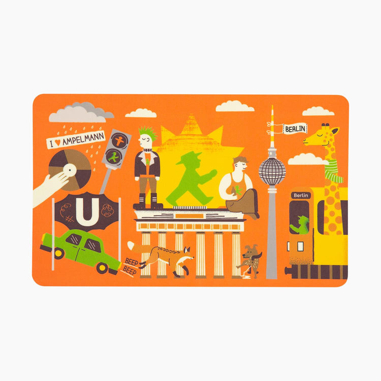 Frühstücksbrett - spülmaschinengeeignet & schnittfest - 23,5x14,5 cm in Orange mit bunten Berlin-Illustrationen (Ampelmann)