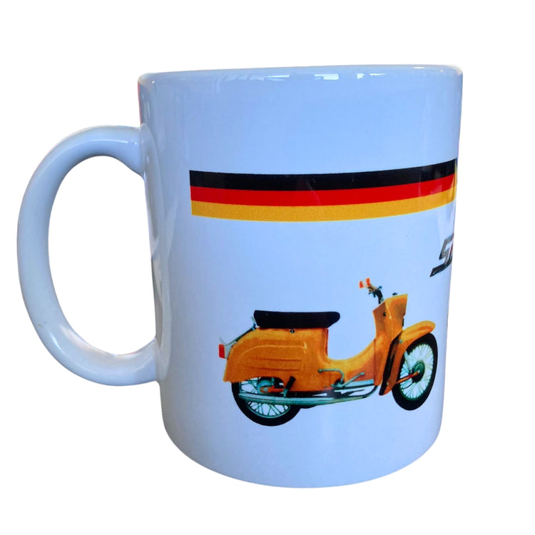 Entdecken Sie unseren stilvollen Kaffeebecher mit dem kultigen DDR-Roller "Schwalbe". Dieser Becher ist nicht nur spülmaschinenfest, sondern auch ein echter Hingucker in Ihrer Küche oder im Büro.