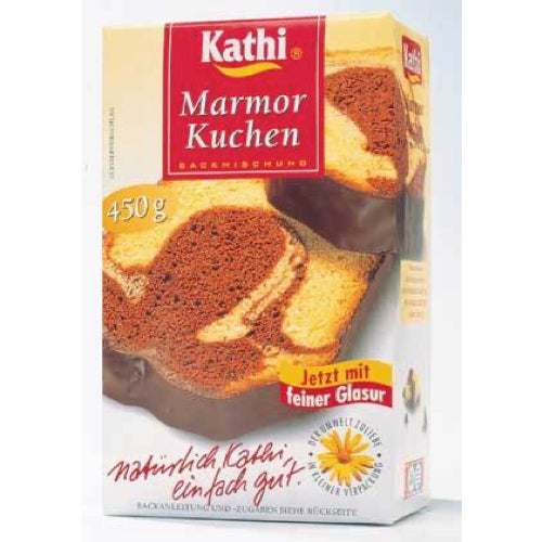 Die Packung Marmorkuchenenthält 355g Backmischung, 20g Kakaomischung und 75g kakaohaltige Fettglasur. Ausreichend für Kastenform (25 cm) oder Gugelhupfform (23 cm Ø ) Sie geben nur noch hinzu 3 Eier, 200g Butter oder Margarine und 3 bis4 EL Milch oder Wasser. Inhalt: 365 g Backmischung, 10 g Kakaomischung, 75 g kakaohaltige Fettglasur Zutaten:BACKMISCHUNG: Zucker, Weizenmehl, Weizenstärke, Backtriebmittel (Dinatriumdiphosphat, Natriumhydrogencarbonat), Speisesalz, Aroma KAKAO (2,2%):stark entölter Kakao.KAKAOHALTIGE FETTGLASUR (16,7%):Pflanzliches Fett, gehärtet (Palm), Zucker, stark entölter Kakao, Emulgator Sonnenblumenlecithin, Aroma (enthält Lactose). Kann Spuren von Haselnüssen, Ei, und Milchpulver enthalten Nährwertangaben:je 100 g fertiges Gebäck Brennwert 2002 (480) kJ(kcal), Fett 29g davon gesättigte Fettsäuren 13g, Kohlenhydrate 49g davon Zucker 25g, Eiweiß 5,1g, Salz 0,80g Herstellerinformationen: KATHI Rainer Thiele GmbH Berliner Str. 216 06116 Halle