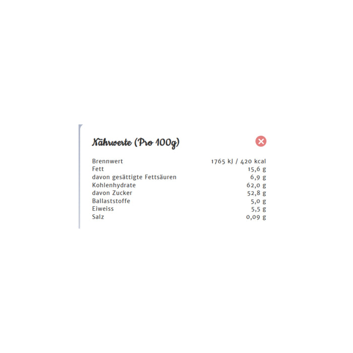 Kann enthalten: andere glutenhaltige Getreide, Ei, Soja, Haselnüsse, Pistazien, Sellerie, Senf, Sesam.