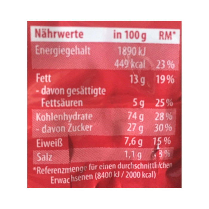 Nährwertangaben pro 100g: Brennwert 449kcal/1890kJ, Fett 13g davon gesättigte Fettsäuren 5g, Kohlenhydrate 74g davon Zucker 27g, Eiweiß 7,6g, Salz 1,1g