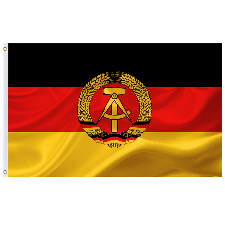 Robuste DDR-Fahne 90x150 cm mit seitlichem Saum inkl. 2 Metall-Ösen zur Befestigung – wetterfest & detailgetreu