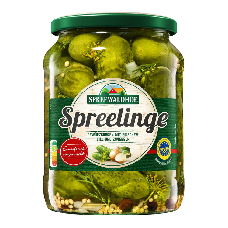 Sie Gewürzgurken Spreelinge werden nach unserer bewährten Original-Rezeptur des Spreewaldhofs verarbeitet, die frischen Dill und Zwiebeln enthält. Genießen Sie den klassischen Geschmack des Spreewalds in jedem Bissen!