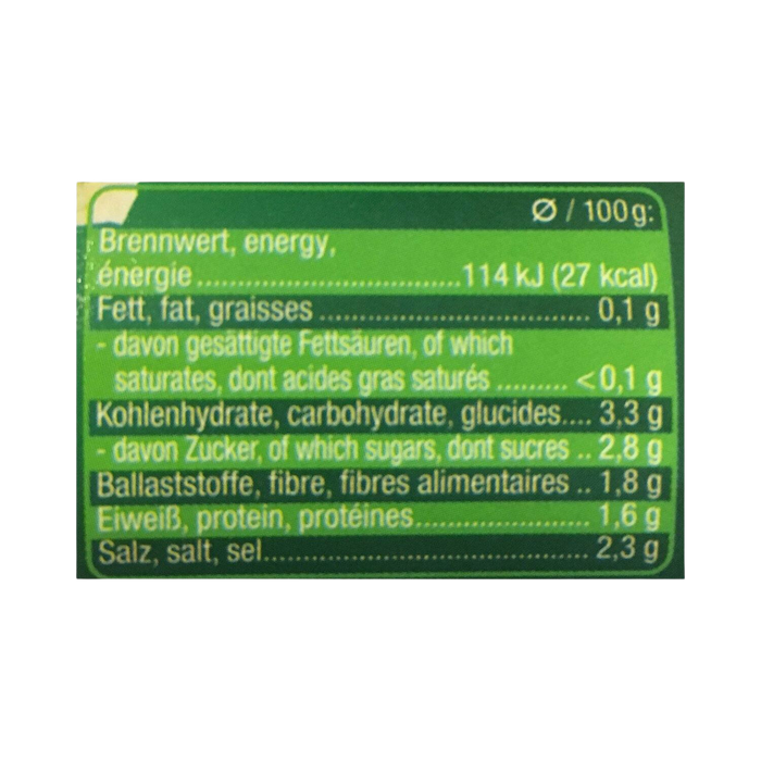 Zutaten: Sauerkraut (Weißkohl aus kontrolliertem Anbau, Speisesalz, Antioxidationsmittel E 300), Trinkwasser, Schweineschmalz, Bauchspeck (Schweinefleisch, Konservierungsstoff E 250, Glukosesirup, Geschmacksverstärker E 621, Buchenholzrauch), Kartoffelstärke, Gemüseboullion (enthält Milchbestandteile, Sellerie), Zwiebel, Zucker, Karotten, Gewürze (u.a. Senfsaat), Würze (Geschmacksverstärker E 627, E 631, Aroma enthält Weizen, Soja) Kümmel, Wacholder