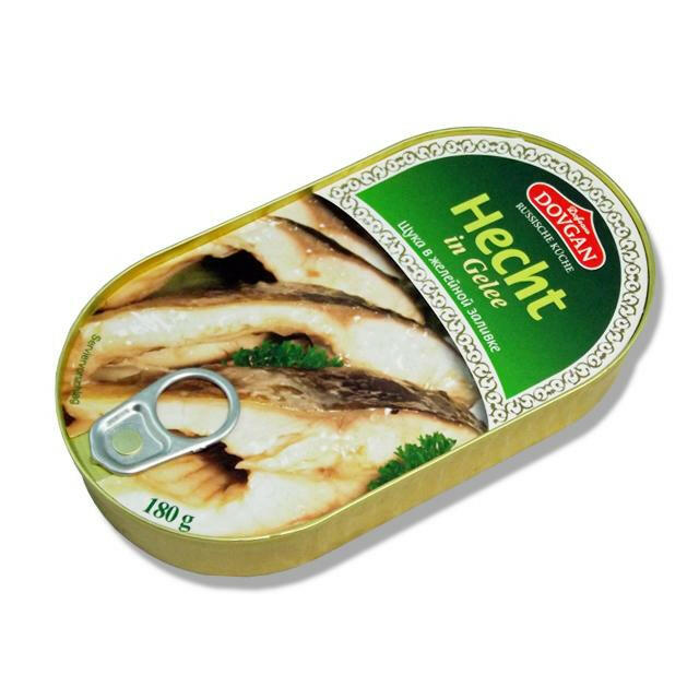 Hechtstückchen in Gelee, ohne Haut, Flossen, Schwanzflossen und Innereien, mit Gräten. Eingelegt nach russischer Art mit Karotten, schwarzem Pfeffer und Piment. Hecht für dieses Produkt stammt aus Aquakultur in Lettland und Litauen.