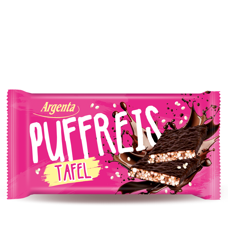 Knusprig, cremig, unwiderstehlich – die Argenta Puffreistafel kombiniert luftig-leichten Puffreis (9%) mit einer zartschmelzenden Pralines-Krem (40%) und einer feinen Hülle aus edler Zartbitter-Schokolade.