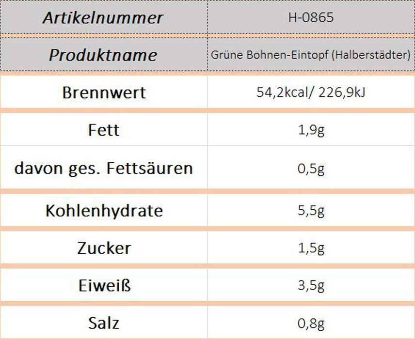 Zutaten: Fleischbrühe(Trinkwasser und Auszüge aus Schweinefleisch) , 24% Grüne Bohnen, 11% Kartoffeln, 3,8% Schweinebauchfleisch, 2,7% Halberstädter Würstchen ( Schweine- und Rindfleisch, Trinkwasser, Speisesalz, Glukosesirup, Stabilisator: Diphosphate, Antioxidationsmittel: Ascorbinsäure, Konservierungsstoff: Natriumnitrit, Schafsaitling, Schweinedarm, Rauch), Möhren, WEIZENMEHL, 1,7% Speck, Speisesalz, Würze, gekörnte Brühe (Würze, Raps-, Mais,- und Sonnenblumenöl), Röstzwiebeln (Zwiebeln, Rapsöl, Palmöl), Gewürze (SELLERIE), Kräuter