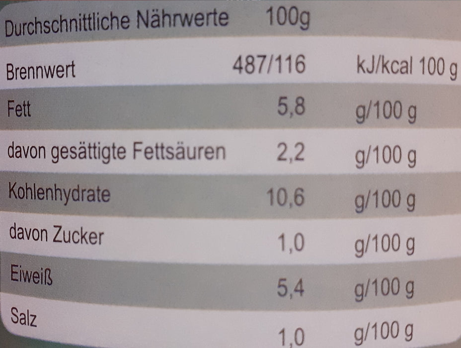 Zutaten: Wasser 36%, Kartoffeln -roh- 15,80%, gelbe Erbsen -ungeschält- 14,30%, Schweinefleisch 13,60%, Bockwurst (78% Schweinefleisch, Speck, Trinkwasser, Kochsalz, Gewürze, Buchenholzrauch) 6,25%, Gemüse (Sellerie, Porree, Möhren in versch. Gewichtsanteilen) 5,80%, Schwarte, Rückenspeck (100% Schweinefleisch, Nitritpökelsalz, Rauch), Salz, Rinderbrühe.