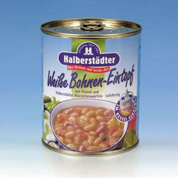 Zutaten: Fleischbrühe, 20% Weiße Bohnen, 17% Kartoffeln, 6,1% Gemüse (Möhren, Poree), 3,7% Schweinekopffleisch, 2,7% Halberstädter Würstchen (Schweine- und Rindfleisch, Trinkwasser, Speisesalz, Glukosesirup, Gewürze, Würze, Stabilisator: Diphosphate, Antioxidationsmittel: Ascorbinsäure, Konservierungsstoff: Natriumnitrat, Naturdarm, Rauch), 1,7% Speck, Weizenmehl, Würze, Speisesalz, gekörnte Brühe (Würze, Speisesalz, pflanzliches Fett), Kräuter und Gewürze (mit Sellerie)