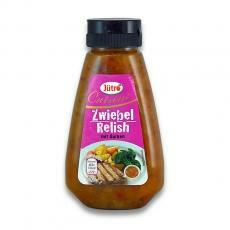Zwiebel - Relish Ein wunderbarer Begleiter für Gegrilltes und Gebratenes, der jedem Gericht den besonderen Pfiff verleiht. Zutaten: Zwiebeln (40%), Branntweinessig, Gurken (15%), Zucker, modifizierte Stärke, Paprika, Gewürze, Salz, Chillies, Säuerungsmittel Citronensäure, Farbstoff Carotin, Konservierungsstoff E202, natürliches Aroma. Inhalt: 270g / 235ml