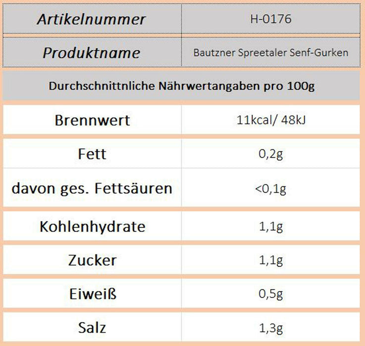 Genießen Sie die unverwechselbare Kombination von Geschmack und Tradition mit den "Bautzner Spreetaler Senf-Gurken". Diese delikaten Gurken, verfeinert mit dem einzigartigen Geschmack des Bautzner Senfs, bieten Ihnen eine geschmackliche Harmonie, die ohne Konservierungsstoffe auskommt.