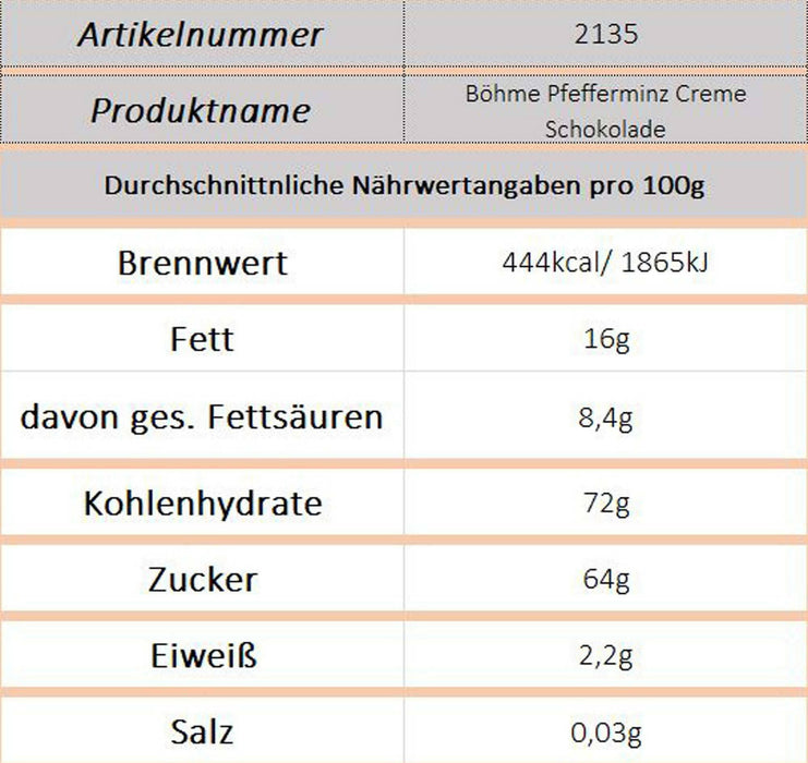 Erleben Sie den belebenden Genuss der Böhme Creme-Schokolade mit Pfefferminzfüllung! Diese raffinierte Schokolade vereint zarten Vollmilchschmelz mit einer angenehm kühlen Creme aus natürlichem Pfefferminzöl – für alle, die es erfrischend mögen.