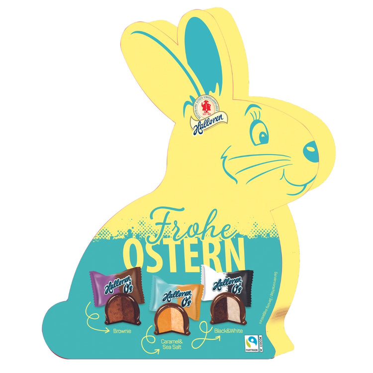 Der Halloren-Osterhase bringt süße Osterfreude mit 14 einzeln verpackten, doppelt gefüllten Zartbitter-Pralinen. Die edlen Kugeln gibt es in drei köstlichen Sorten: Black & White, Caramel & Sea Salt sowie Brownie. Perfekt als Geschenk oder zum Selbstgenießen – ein Highlight für alle Schokoladenliebhaber!