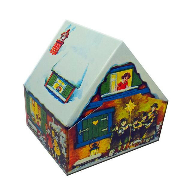 3 Lebkuchen mit Schokoladenüberzug im roten Lebkuchenhäuschen aus Pappe