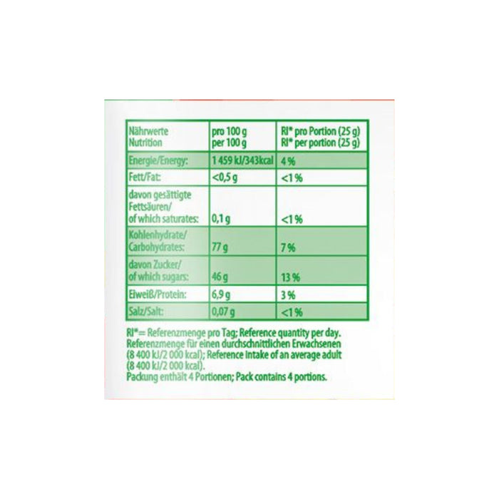 Zutaten: Glukosesirup; Zucker; Gelatine; Dextrose; Fruchtsaft aus Fruchtsaftkonzentrat: Apfel, Himbeere; Säuerungsmittel: Citronensäure, Weinsäure, Äpfelsäure; Frucht- und Pflanzenkonzentrate: Saflor, Spirulina, Apfel, Schwarze Johannisbeere, Holunderbeere, Kiwi, Aronia, Traube; Sonnenblumenöl; Holunderbeerextrakt; Aroma; Überzugsmittel: Bienenwachs weiß und gelb.