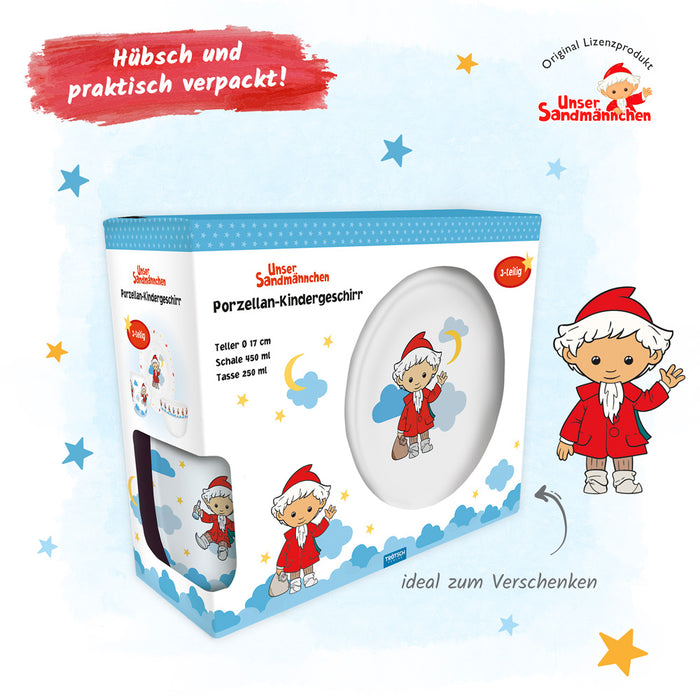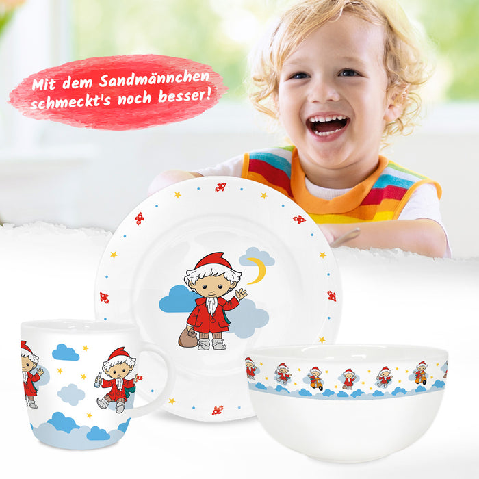 Ob Frühstück, Vesper oder Abendbrot, mit dem Sandmännchen und seinen Freunden schmeckt's noch besser, denn das Set aus Teller, Tasse und Schüssel ist ein echter Blickfang auf dem Tisch! Praktisch und schön ist das Geschirr ein treuer Alltagsbegleiter – und ein Muss für kleine Sandmann-Fans!