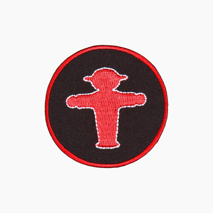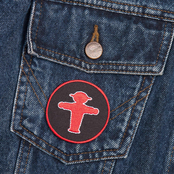 Schwarz-roter Ampelmann-Aufnäher mit Kleberückseite rund zum Aufkleben und Aufbügeln, 6 cm
