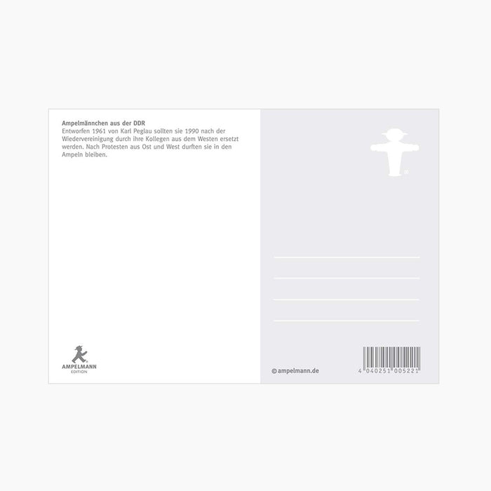 Ein nächtlicher Gruß aus Berlin: Diese elegante Postkarte im tiefen Schwarz zeigt die ikonischen AMPELMANN-Figuren – Geher und Steher – in einem stimmungsvollen Nachtmotiv. Ideal für urbane Grüße, Sammler oder als stilvolles Souvenir aus der Hauptstadt.