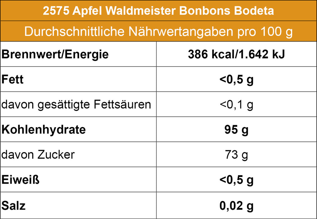 Nährwertangaben pro 100g: Brennwert 385,9kcal/1616kJ, Eiweiß 0g, Kohlenhydrate 95,3g davon Zucker 93g, Fett 0g davon gesättigte Fettsäuren 0g, Salz 0g, Ballaststoffe 0g