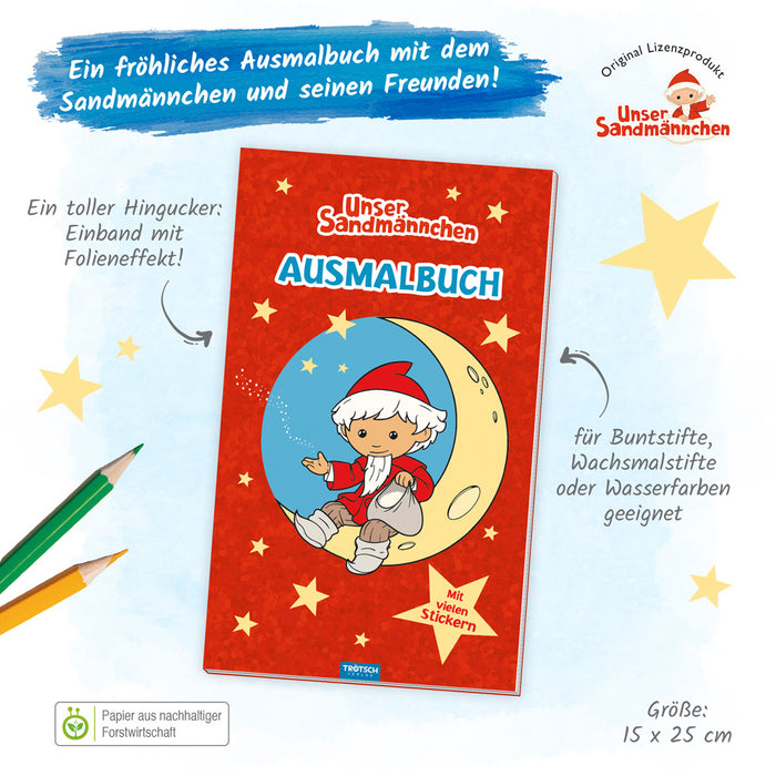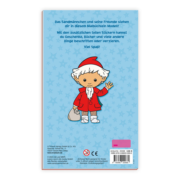 Das Sandmännchen und seine Freunde wollen bunt ausgemalt werden, also schnell die Stifte rausgeholt und losgemalt! Auf 12 Seiten erscheinen einfache, kindgerechte Motive mit farbigen Ausmalvorlagen aus der Welt unseres Sandmännchens. Das sorgt für Spaß und schnelle Erfolgserlebnisse. Mit den zusätzlichen Stickern können Geschenke, Bücher und andere Dinge verziert werden. Ein kurzweiliges Geschenk für kleine Sandmännchen-Fans!