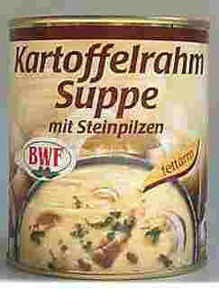 Dose 800g . Zutaten: Trinkwasser, 24% Kartoffeln, 7,50% Steinpilze (Boletus edulis), Zwiebeln, Sahne, Würze, Butter, modifizierte Stärke, pflanzliches Öl, jodiertes Speisesalz, Stabilisator: Guarkernmehl, Gewürze. (GP 1kg/l = 2,36 Euro)