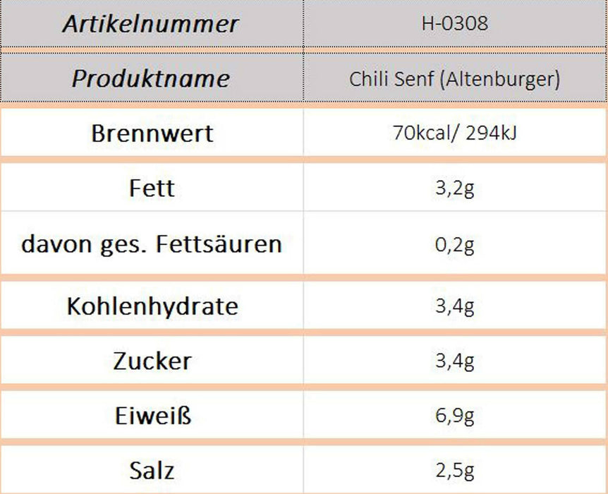 Zutaten: natürliches Mineralwasser, Senfschrot, Branntweinessig, Kalahari Salz, Zucker, 2% Chili