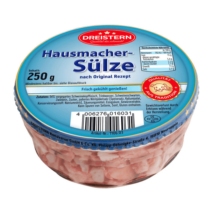 Der Klassiker für Liebhaber traditioneller Hausmannskost! Die Hausmacher Sülze von Dreistern überzeugt mit ihrem herzhaften Geschmack und einer Rezeptur wie selbst gemacht. Einfach frisch gekühlt genießen und echte Qualität aus Tradition erleben.