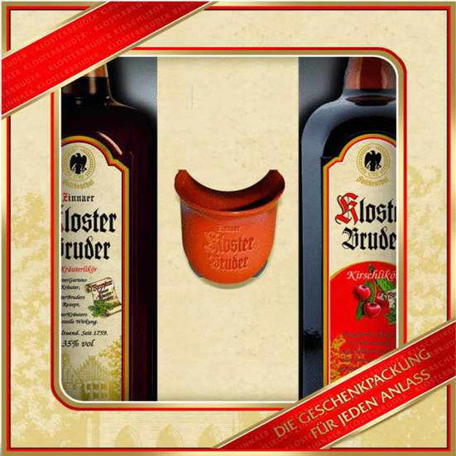 Eine Flasche Zinnaer Klosterbruder 0,35 l (35% vol.), eine Flasche Klosterbruder Kirschlikör 0,35 l (20% vol.)und einen exklusiven Klosterbruder Tonbecher befinden sich in der neuen Geschenkpackung.