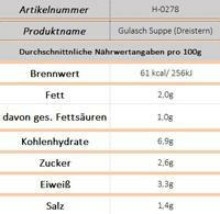 Zutaten: Wasser, 14% Kartoffeln, 11% Rindfleisch (vorgegart), Zwiebeln, 7% Champignons, 4% Paprika, Tomatenmark, modifizierte Stärke, jodiertes Speisesalz (Speisesalz, Kaliumjodat), Zucker, Tomatenkonzentrat, Gewürze (enthält Sellerie), Mehl (Weizen, Reis), Gewürzextrakte, Maltodextrin, Maiskeimöl, Dextrose, Rindfleischextrakt, Stärke, Karamellzuckersirup, Karotten, Tomatenpulver, Aromen (enthält Sellerie), rote Chilischoten, Kräuter (enthält Sellerie).