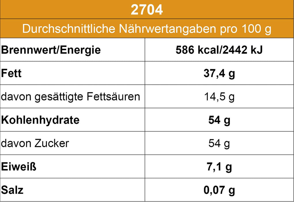 Nährwertangaben pro 100g: Energie 2438 kJ /256 kcal, Fett 39,8g /davon gesättigte Fettsäuren 29,9g Kohlenhydrate 49,1g / davon Zucker 49,1 g Eiweiß 6,2g Salz 0,05g