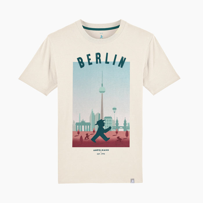 Hellbeiges Kinder-T-Shirt mit stylischen Berlin & Ampelmann-Design auf der Vorderseite aus Bio-Baumwolle mit höchsten Tragekomfort
