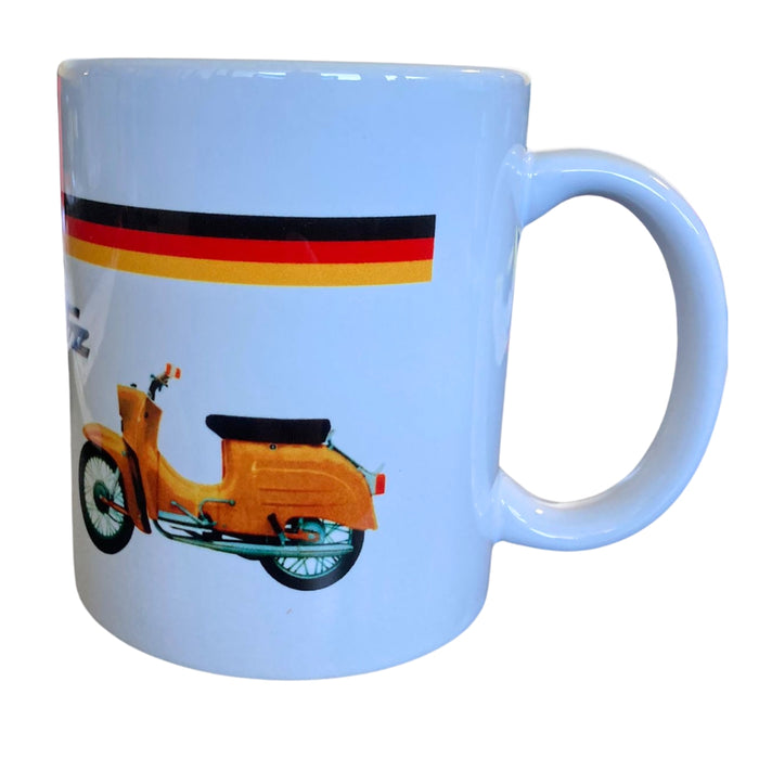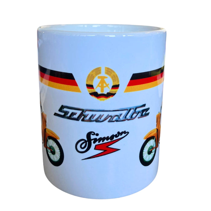 Entdecken Sie unseren stilvollen Kaffeebecher mit dem kultigen DDR-Roller "Schwalbe". Dieser Becher ist nicht nur spülmaschinenfest, sondern auch ein echter Hingucker in Ihrer Küche oder im Büro.